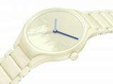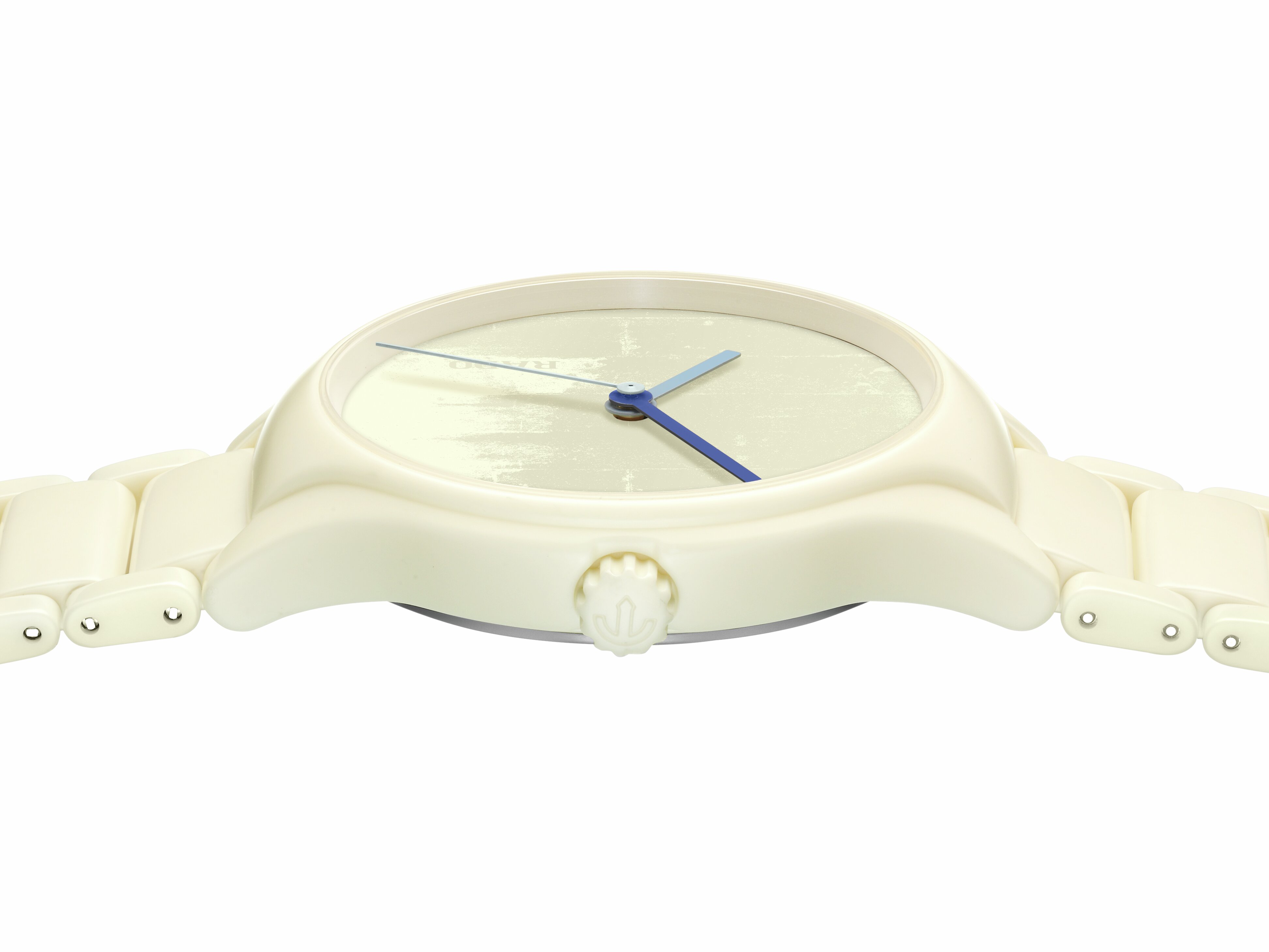 This first watch is presented in Ivory White, reference 4320B, across its monobloc high-tech ceramic case and matching crown and bracelet, telling a story of pure, minimalist elegance. It is the first time that this specific colour has been deployed in high-tech ceramic. It’s worth remembering that the colour runs right through the material – the final hue is not just a coating or finish, but acquired during sintering, when it is heated to 1,450°C. Faithfully recreating an exact shade with this complex methodology is no small thing and took Rado’s experts years to perfect. This timepiece is complemented by hands in Lucent Sky Blue (32021), Luminous Ultramarine Blue (32020) and Light Ultramarine Blue (32023).