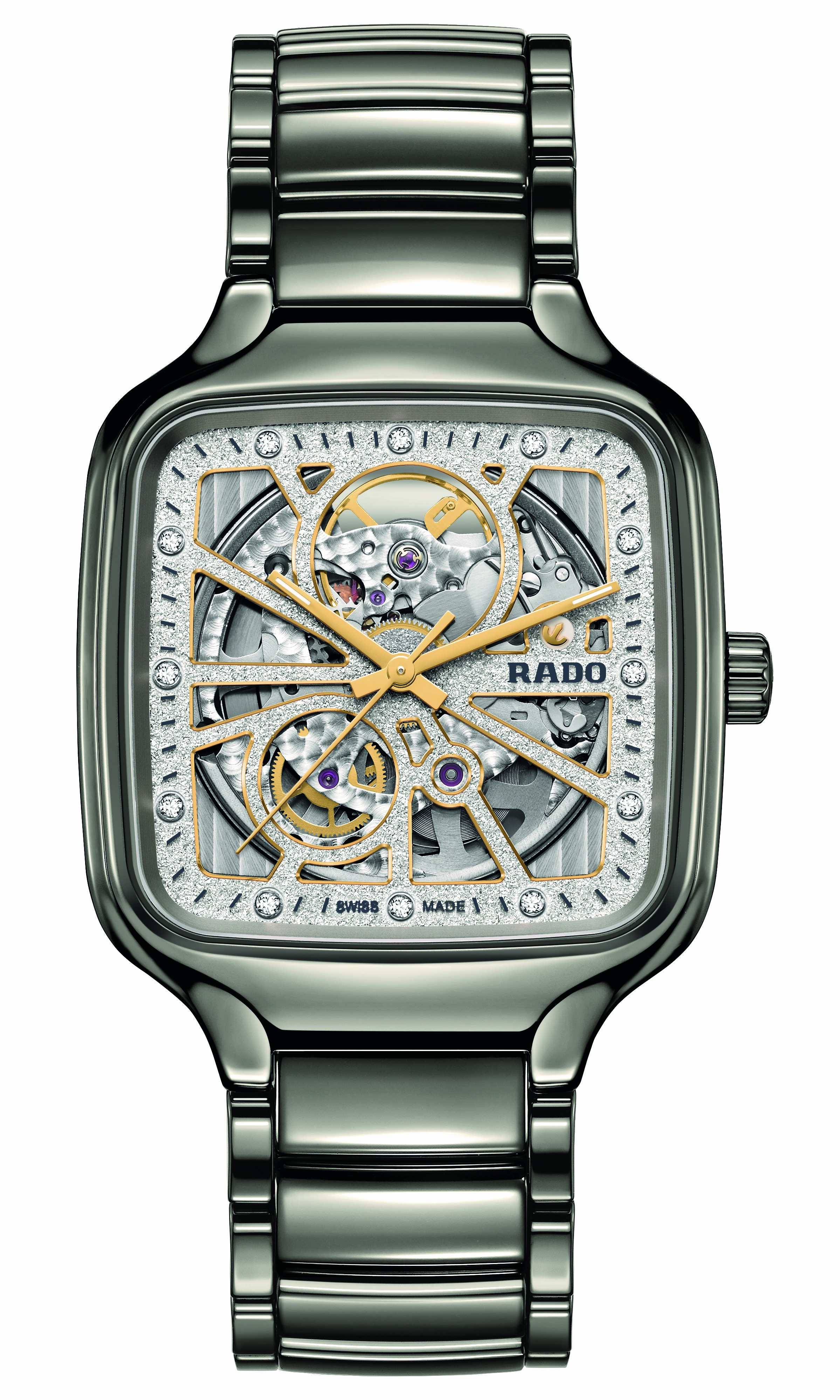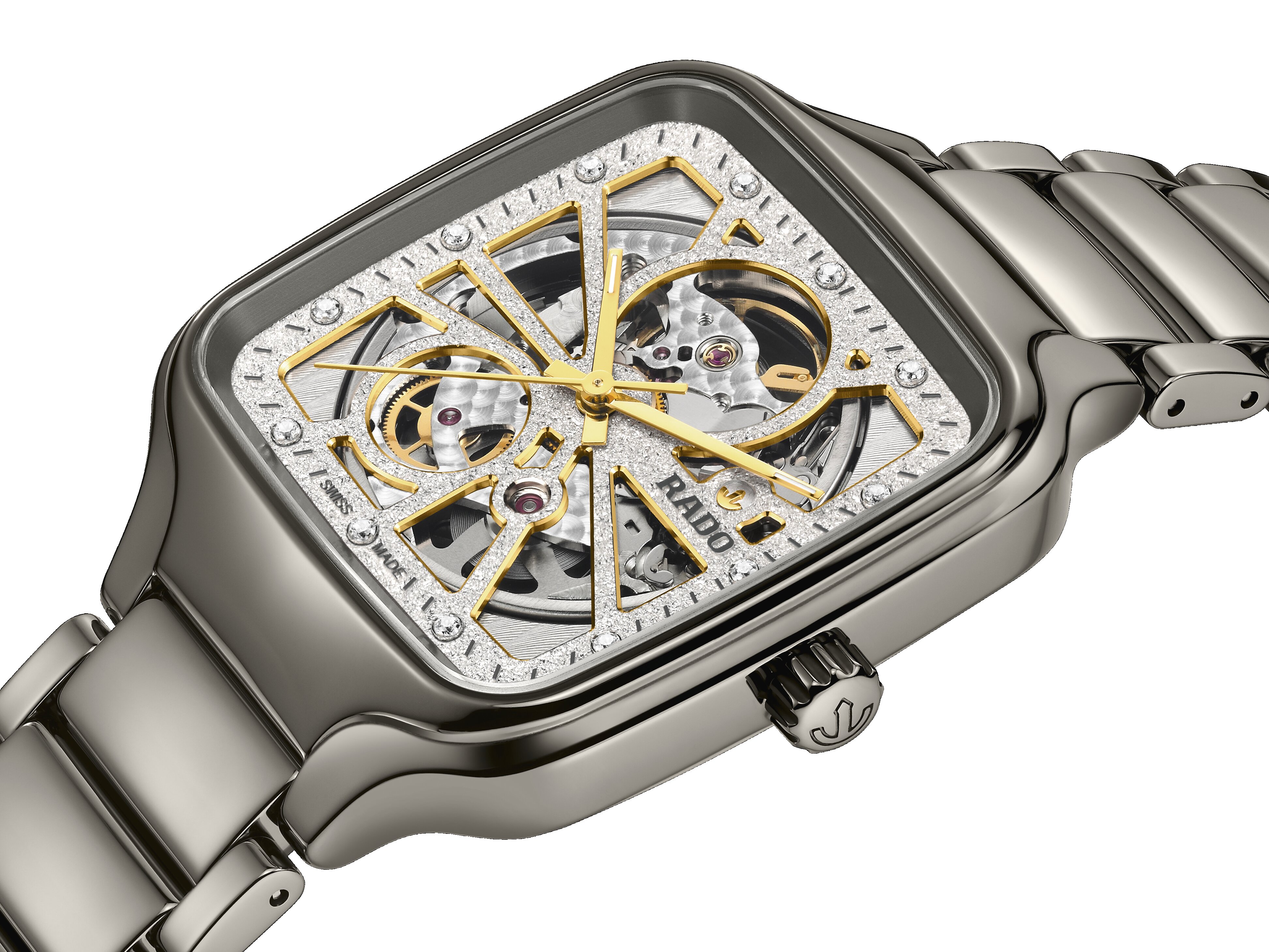 True to Rado’s sterling reputation for innovation, the new dials were developed with a unique electro- forming process that produces a uniform diamond-powder effect. This process also permits the Rado logo, markings and minute tracks to be raised in sharp relief from the base of the dial, the end result of galvanic growth.